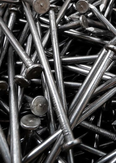 Close-up of industrial metallic nails and bolts piled in a rustic factory setting.